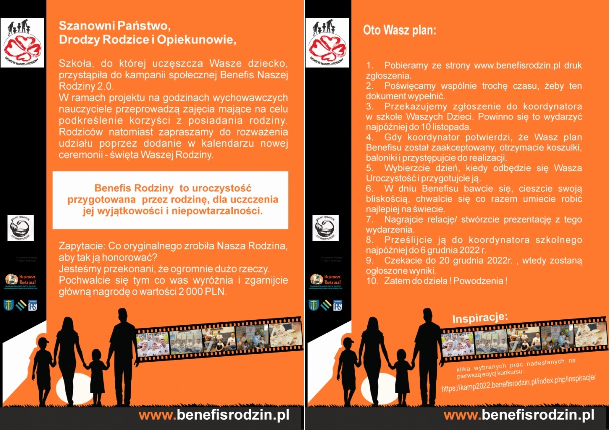 Nasza szkoła przystąpiła po raz drugi do kampanii społecznej Benefis naszej Rodziny. W ramach kampanii, zainicjowanej przez Stowarzyszenie Inicjatyw Społecznych „Solny Gwarek”, a finansowanej z budżetu Ministerstwa Rodziny i Polityki Społecznej, zostaną przeprowadzone zajęcia edukacyjne dla uczniów. Ich celem jest wzmacnianie u dzieci szacunku do rodziców i innych członków rodziny oraz poszukiwanie takich sposobów spędzania czasu razem, aby troszczyć się o wzajemne relacje.